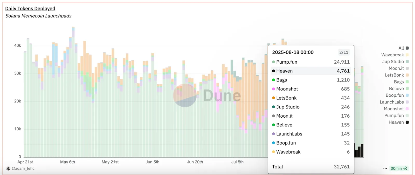 За несколько дней новая площадка уже обогнала LetsBonk по количеству запущенных токенов — 4761 против 434 на 18 августа.