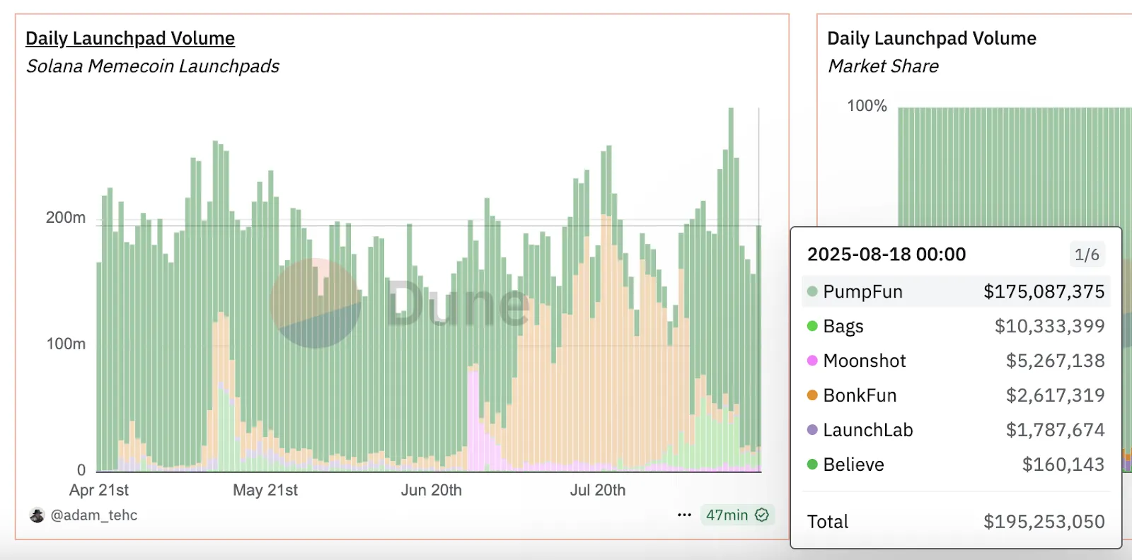 Всего две недели назад ситуация была обратной: LetsBonk контролировала более 80% рынка, а Pump.fun — 5%.