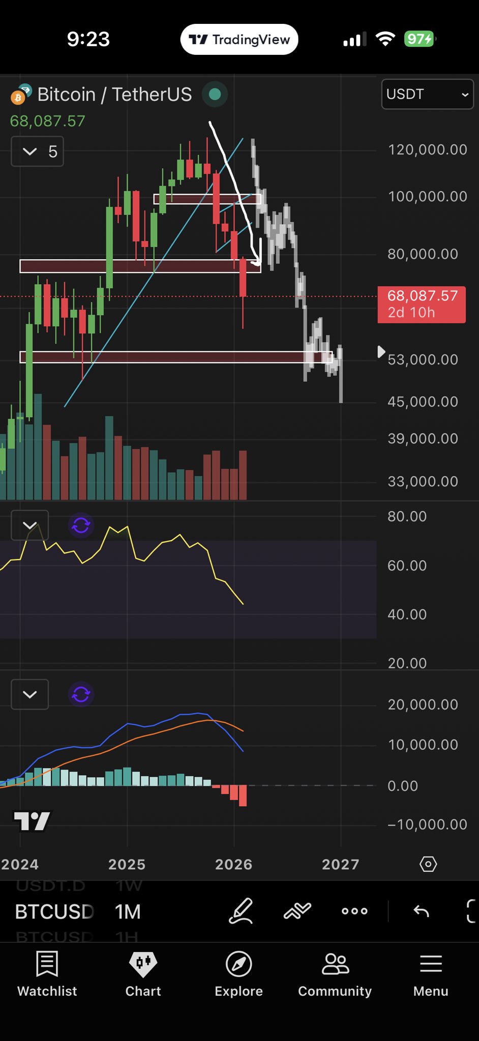 Трейдер Roman указал на стандартные параметры падения в прошлых медвежьих циклах. По данным Glassnode, в предыдущих циклах биткоин терял порядка 80% от пика. На 15-месячном минимуме, зафиксированном в начале февраля, максимальная коррекция $BTC/USD составила около 53% от исторического максимума октября 2025 года. Roman предостерег от поспешных выводов: каждый медвежий цикл сопровождался снижением почти на 80%, а на месячном и недельном графиках признаков разворота пока не наблюдается.