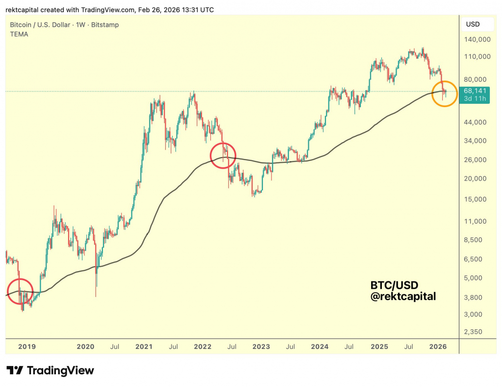 Трейдер и аналитик Rekt Capital прокомментировал ситуацию в соцсети X: 200-недельная EMA теперь выступает как сопротивление, и пока биткоин торгуется ниже нее, история указывает на вероятное продолжение снижения.