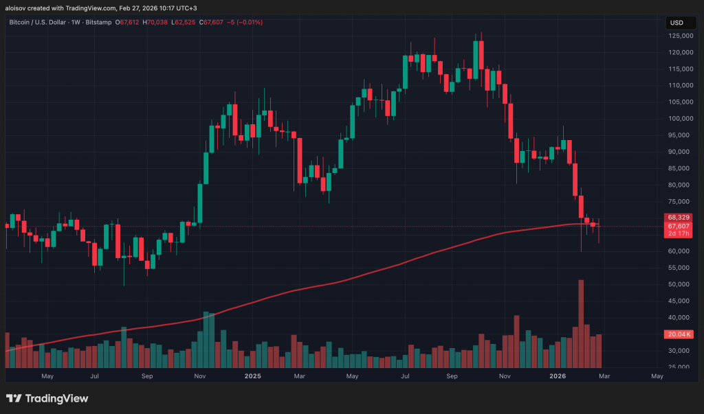 По данным Bitstamp, 26 февраля актив вернулся к уровню $67 488, потеряв за день 1%. Накануне биткоин поднимался до $70 040, предпринимая попытку восстановить два ключевых уровня: 200-недельную экспоненциальную скользящую среднюю (EMA) и старый исторический максимум 2021 года. Обе попытки закончились неудачей.