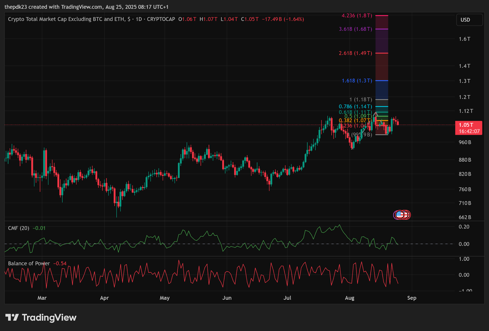 Уровни коррекции Фибоначчи указывают на то, что рынок испытывает трудности вблизи уровня 0,618 (1,07–1,1 трлн долларов США) — критической зоны, которая обычно указывает на продолжение тренда.