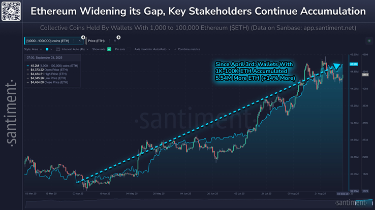 Рост эфира выше психологически важной отметки $4500 был вызван действиями крупных инвесторов, распоряжающихся суммами от 1000 ETH до 100 000 ETH, заявили аналитики платформы Santiment.