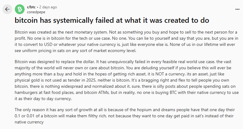 Недавно в биткоин-сообществе Reddit разгорелась дискуссия о том, изменил ли биткоин свои корни. Утверждение о том, что криптовалюта «системно провалилась в том, чем она была», вызвало сотни комментариев, обнаживших раскол между теми, кто считает биткоин «цифровым золотом», и теми, кто всё ещё хотел бы, чтобы он стал настоящей валютой.