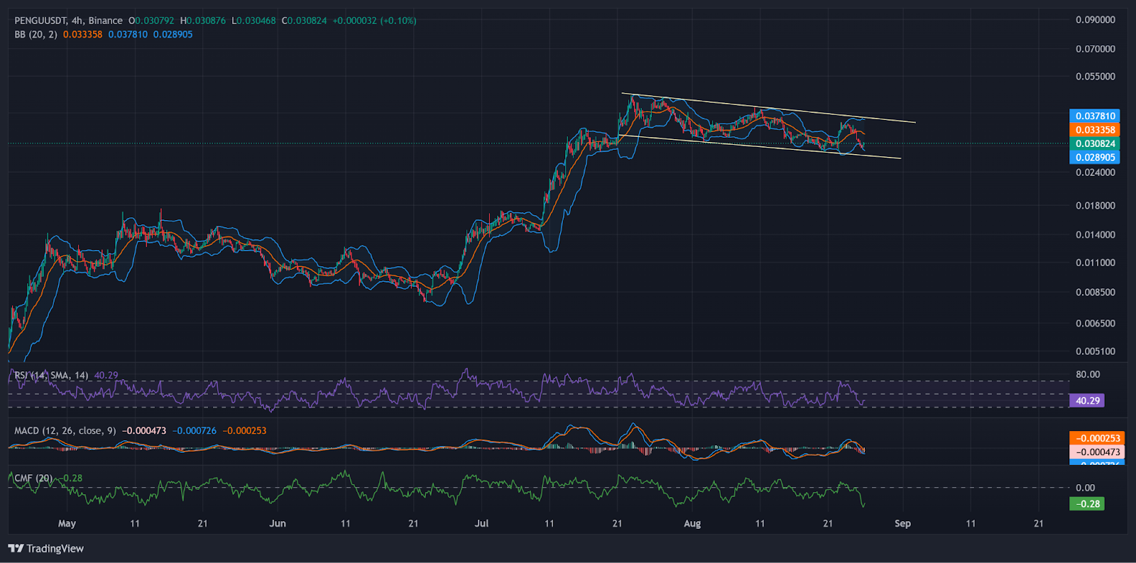 На 4-часовом графике PENGU виден классический медвежий канал после параболического движения в июле. Цена консолидируется в диапазоне от $0,024 до $0,037, при этом повторяющиеся отскоки от верхней линии тренда указывают на сохраняющуюся активность продавцов.