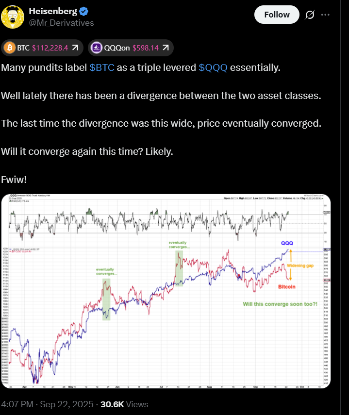 Аналитик Гейзенберг добавил, что значительное расхождение биткоина и Nasdaq, вероятно, снова сойдется, ссылаясь на исторические тенденции — сигнал о том, что BTC может быстро восстановиться в соответствии с недавним историческим максимумом Nasdaq.