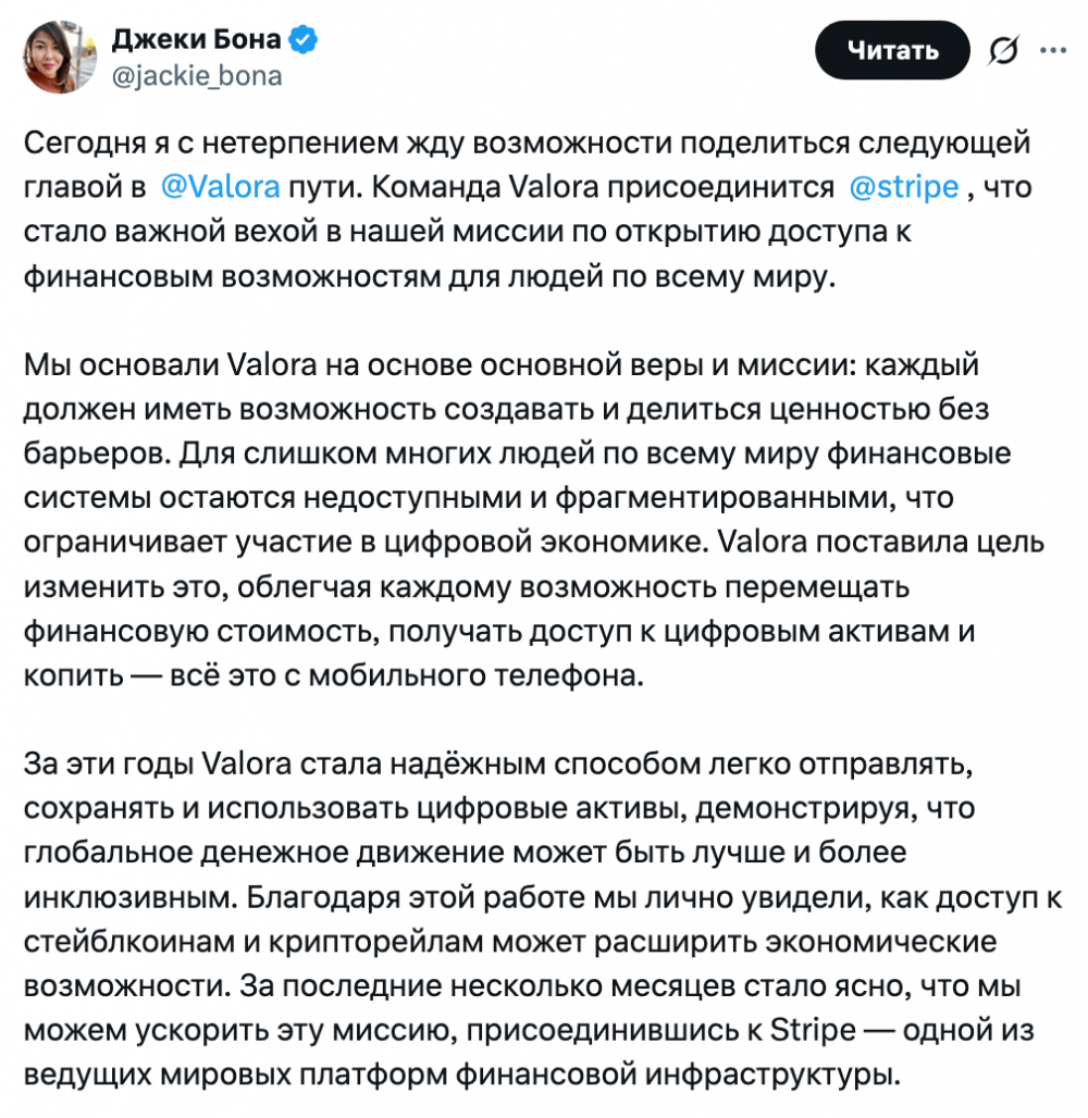 По словам генерального директора Valora Джеки Бона, в результате сделки команда Valora присоединится к Stripe и будет работать над блокчейн‑проектами компании.