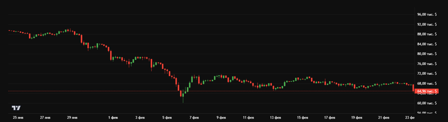 Утром 23 февраля 2026 года биткоин в моменте падал до $64 350. После криптовалюта начала восстанавливаться. На момент написания обзора, биткоин торгуется по $64 969.