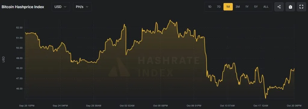 Их оценку подтверждают данные Hashrate Index. После масштабной коррекции крипторынка 11 октября хешпрайс стабильно находится ниже отметки $49 за PH/s в сутки. Более низкие значения метрики в это году фиксировались в апреле, когда курс биткоина обвалился ниже $90 000.