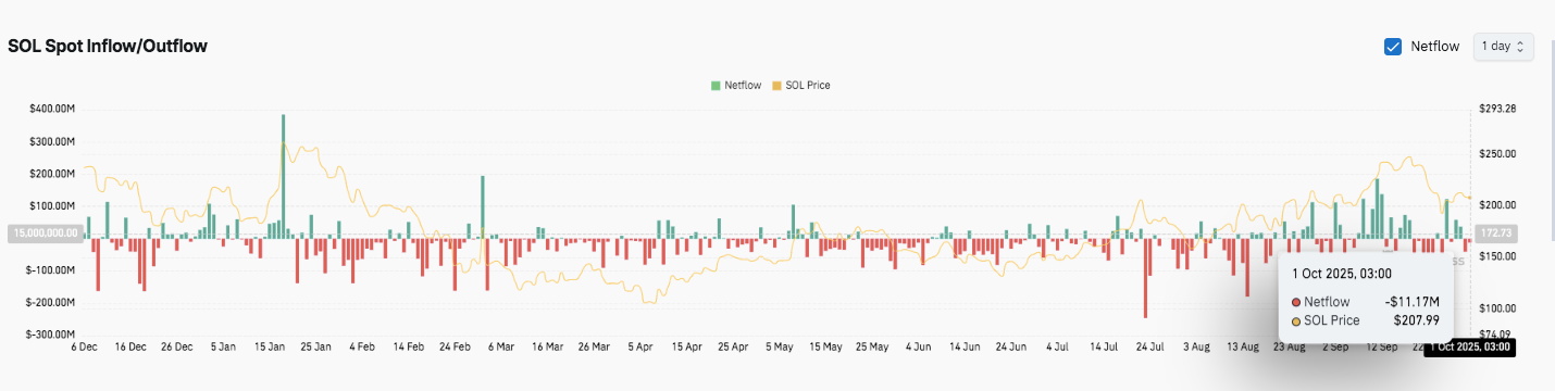 Последние данные показывают отрицательный чистый приток в размере $11,17 млн при цене SOL $207,99. Это свидетельствует о слабом давлении на продажу и осторожном настрое инвесторов.