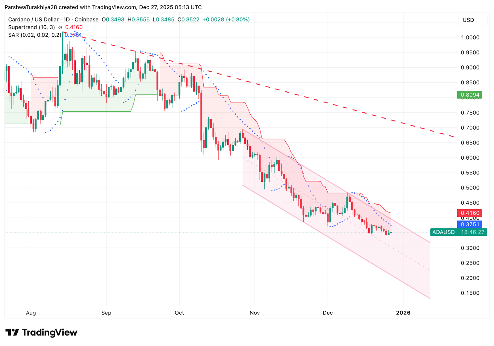 На дневном графике Cardano остаётся запертой внутри чётко определённого нисходящего канала, который с октября ведёт к снижению цены. Каждая попытка роста останавливалась под падающим сопротивлением, в то время как последовательные низкие минимумы подтверждают продолжение тренда.