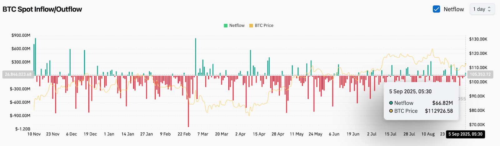 Данные спотовых торгов по сети зафиксировали чистый приток в размере 66,8 млн долларов США 5 сентября, что прервало многонедельный устойчивый отток. Возобновление положительного притока свидетельствует о том, что трейдеры постепенно восстанавливают позиции на текущих уровнях.
