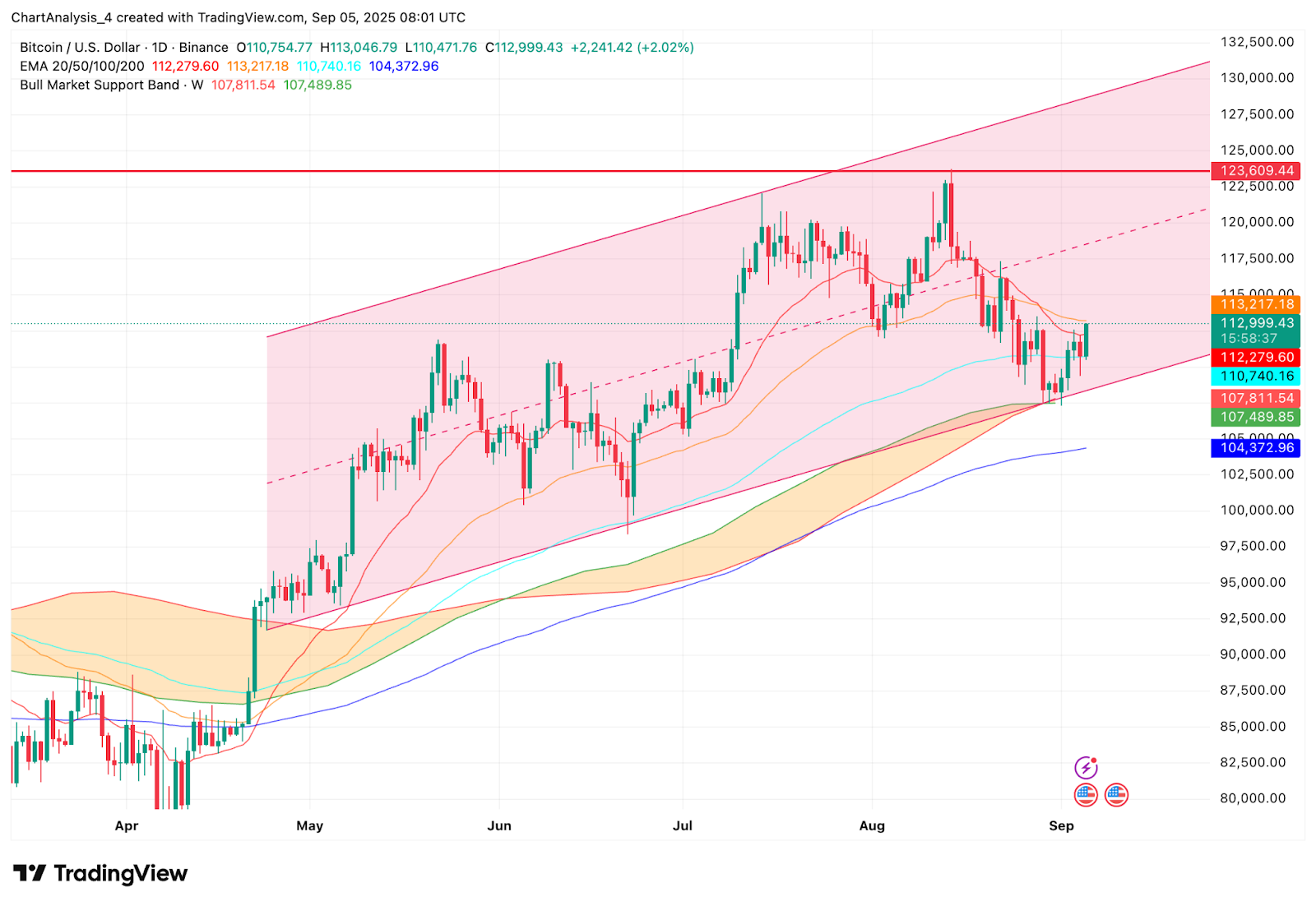 На момент публикации цена биткоина составляла $112 999, что выше $110 500 на прошлой неделе. Отскок обусловлен тем, что BTC защищает свою поддержку канала, а фондовый рынок восстанавливает уверенность. Трейдеры следят за тем, смогут ли приток инвестиций и макроэкономические корреляции поднять цену до $115 000.