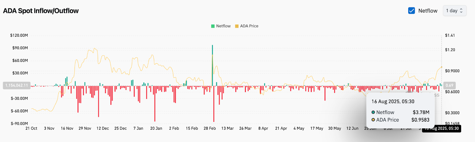 Данные по блокчейну подтверждают оптимистичные настроения. 16 августа ADA зафиксировала чистый приток в размере 3,78 млн долларов США, что стало первым значительным положительным потоком спотовых токенов за несколько недель, отражающим возобновление накопления. Этот сдвиг совпадает с восстановлением цены до 0,95 доллара США, что свидетельствует о сближении институционального и розничного покупательского давления.