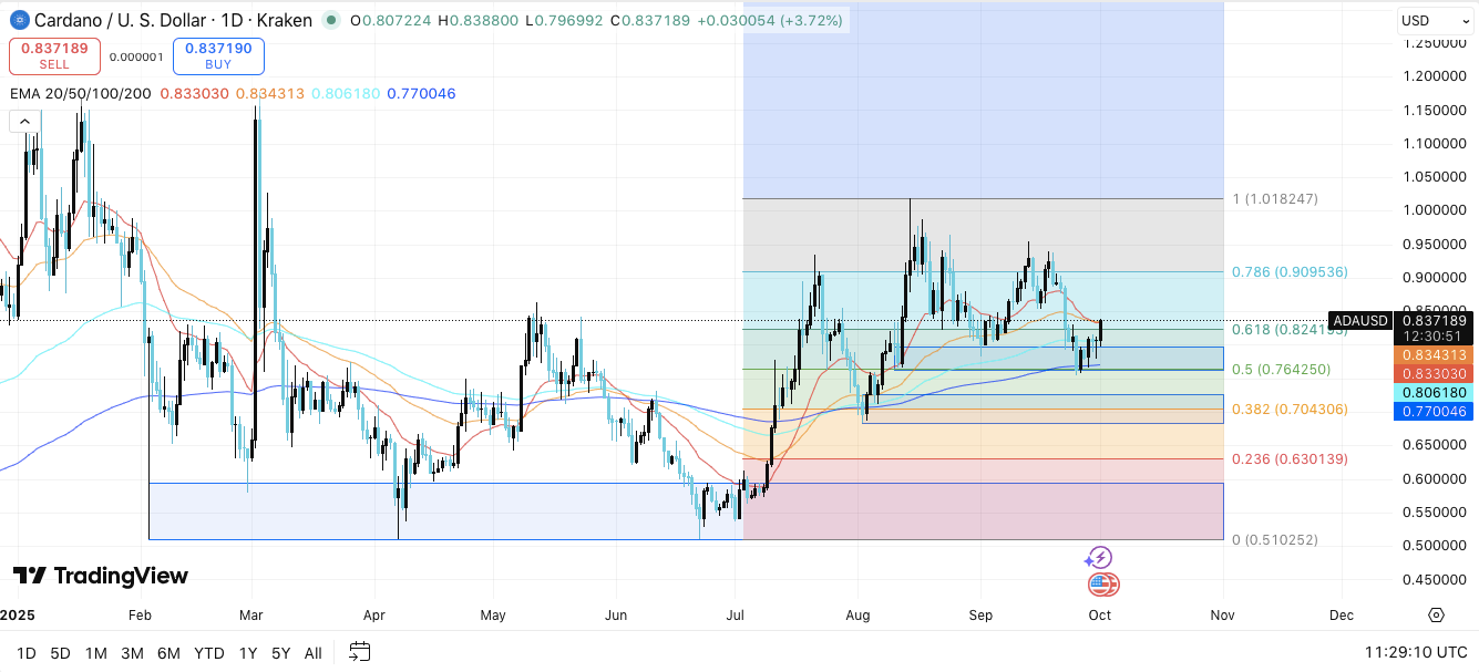 Краткосрочные перспективы ADA зависят от того, сумеют ли покупатели защитить зону $0,824 и преодолеть кластерные экспоненциальные скользящие средние (EMA) на уровне $0,83–$0,84. Удержание выше этой области усилит импульс к $0,91 и, в конечном итоге, к $1,01..