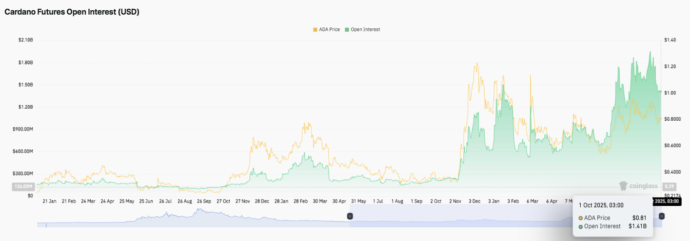 Помимо графиков, ценную информацию даёт активность на рынке деривативов. Открытый интерес к фьючерсам Cardano вырос с менее чем 300 миллионов долларов в начале этого года до 1,41 миллиарда долларов к октябрю. Этот устойчивый рост отражает рост числа участников и появление новых длинных позиций, а не ликвидацию коротких.