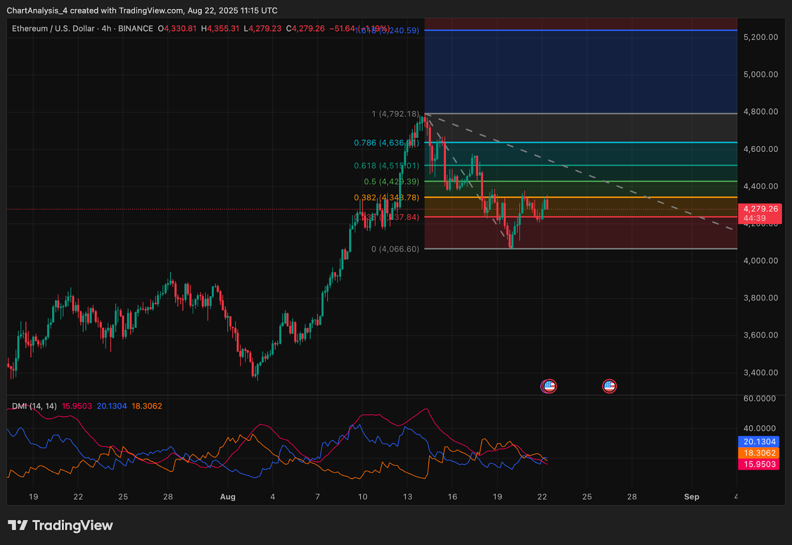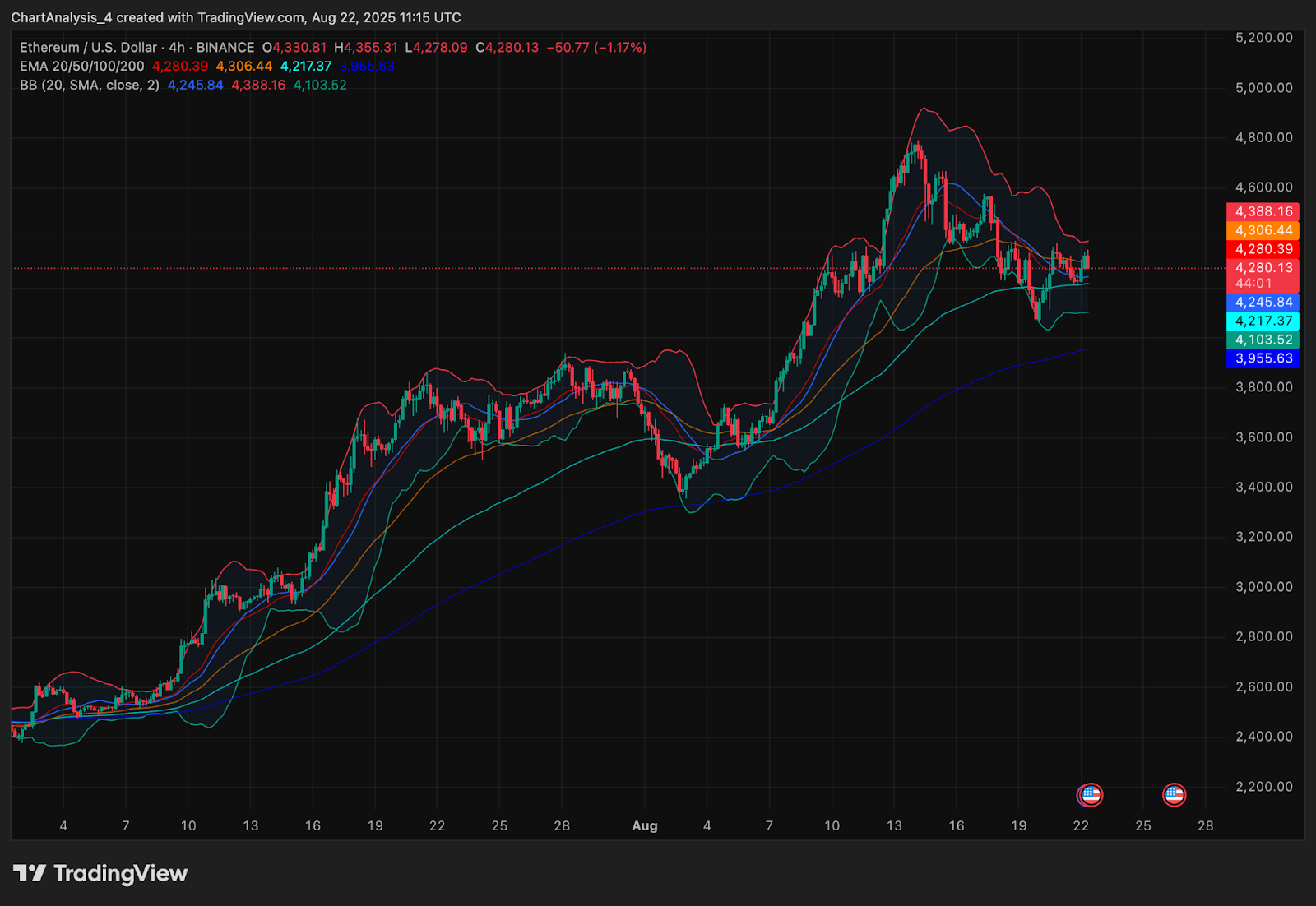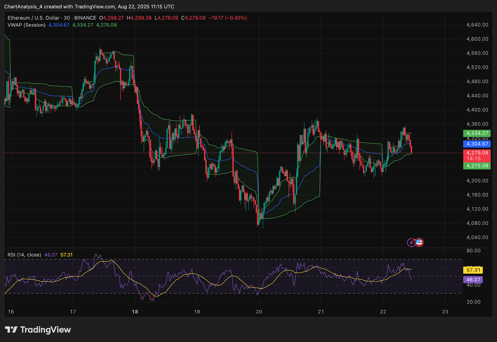 На 30-минутном графике RSI опустился до 46,0, не сумев удержаться выше 57,0, что отражает ослабление внутридневного импульса. Тем временем, VWAP показывает, что ETH торгуется ниже $4304, сигнализируя о том, что цена пытается удержаться на сессионных уровнях. Нисходящий канал на 4-часовом графике продолжает сжимать цену, при этом сопротивление в районе $4380–$4400 неоднократно отскакивало от него.