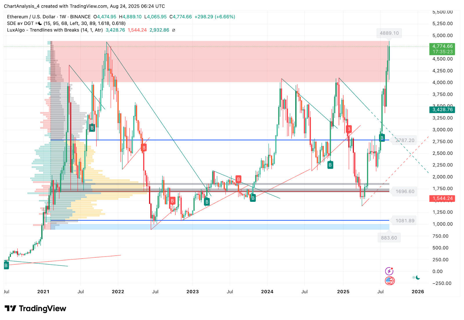 Цена Ethereum сегодня колеблется около $4774, немного снизившись после мощного ралли, которое ранее на этой неделе подняло ETH выше $4800. Резкий скачок произошел после того, как ETH вырвался из многонедельного нисходящего канала, восстановив критически важную линию поддержки в районе $4400. Сейчас рынок находится в решающей точке: сможет ли ETH сохранить импульс к достижению психологического уровня $5000 или столкнется с краткосрочной консолидацией.