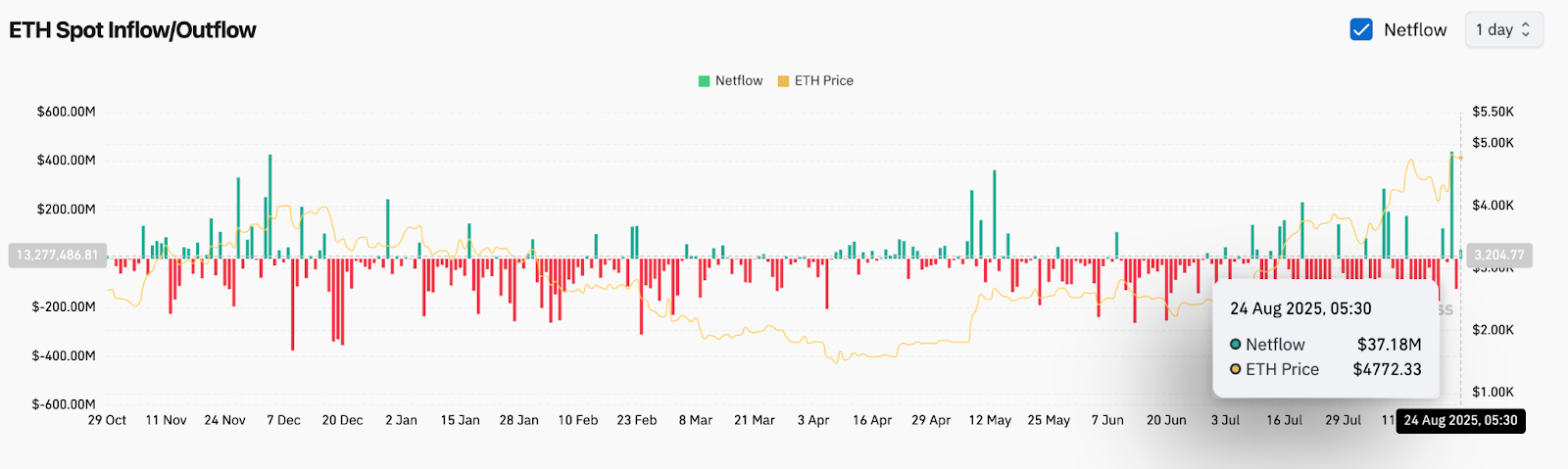 Рост цены Ethereum обусловлен как техническими факторами, так и динамикой потоков. Данные по спотовому притоку средств от 24 августа показали чистый положительный результат в размере $37,1 млн, что усилило интерес к накоплению на более высоких уровнях. Хотя приток средств меньше по сравнению с потоками Bitcoin, отскок ETH соответствует более широкому рыночному аппетиту к риску и сигнализирует о возобновлении спроса среди институциональных инвесторов.