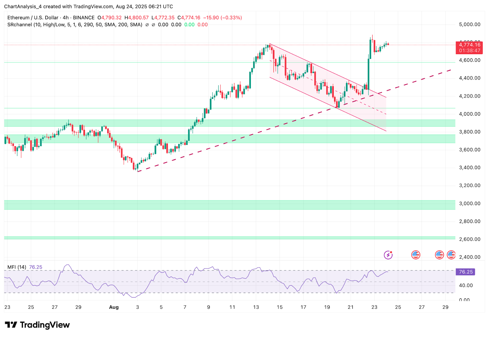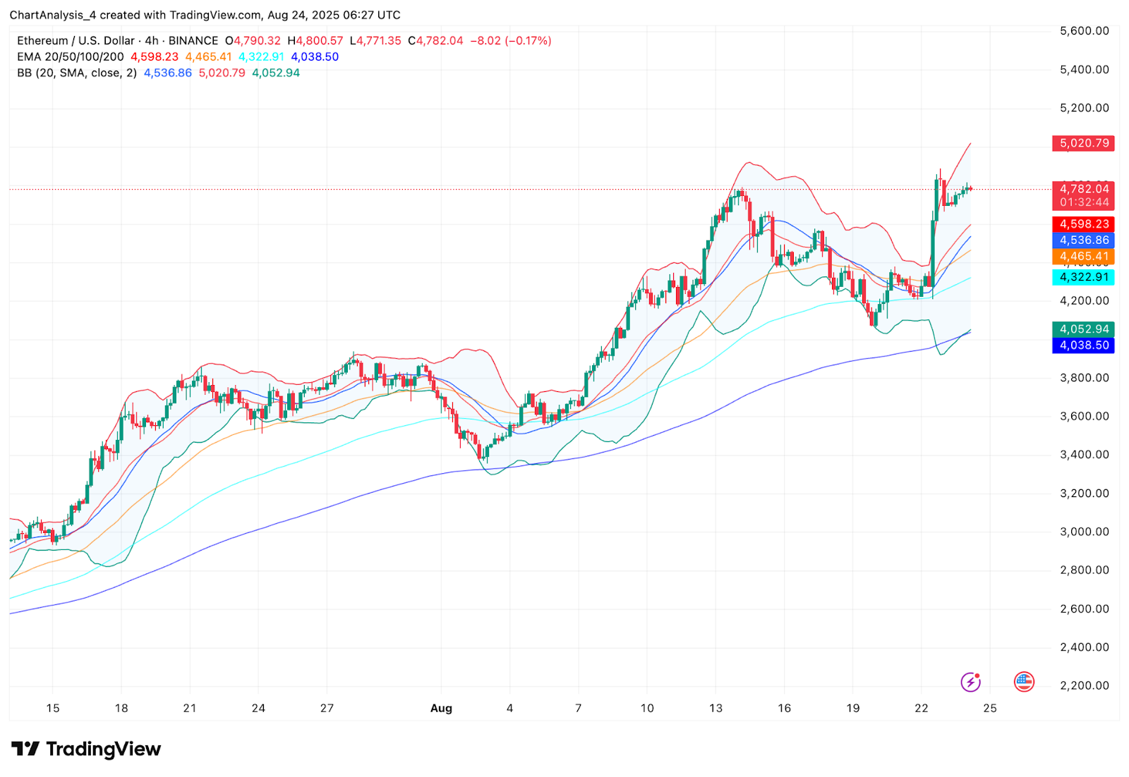 На 4-часовом графике Ethereum резко развернулся с отметки $4200, вырвавшись из падающего канала и вернувшись к восходящей линии тренда, сформировавшейся в начале августа. Восстановление подняло ETH до зоны сопротивления $4750–$4800, которая в прошлых циклах служила одновременно и скоплением ликвидности, и ключевым уровнем отскока.