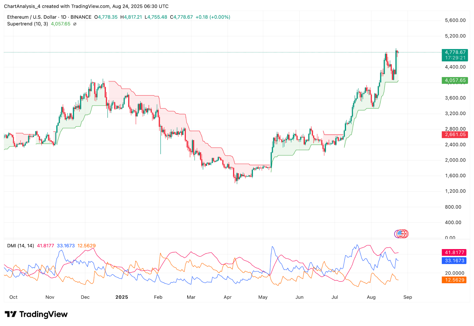 Индикатор Supertrend на дневном графике уверенно по-бычьи держится выше $4050, подчеркивая, что макроэкономический уклон сохраняется до тех пор, пока ETH удерживается выше своей базы тренда.