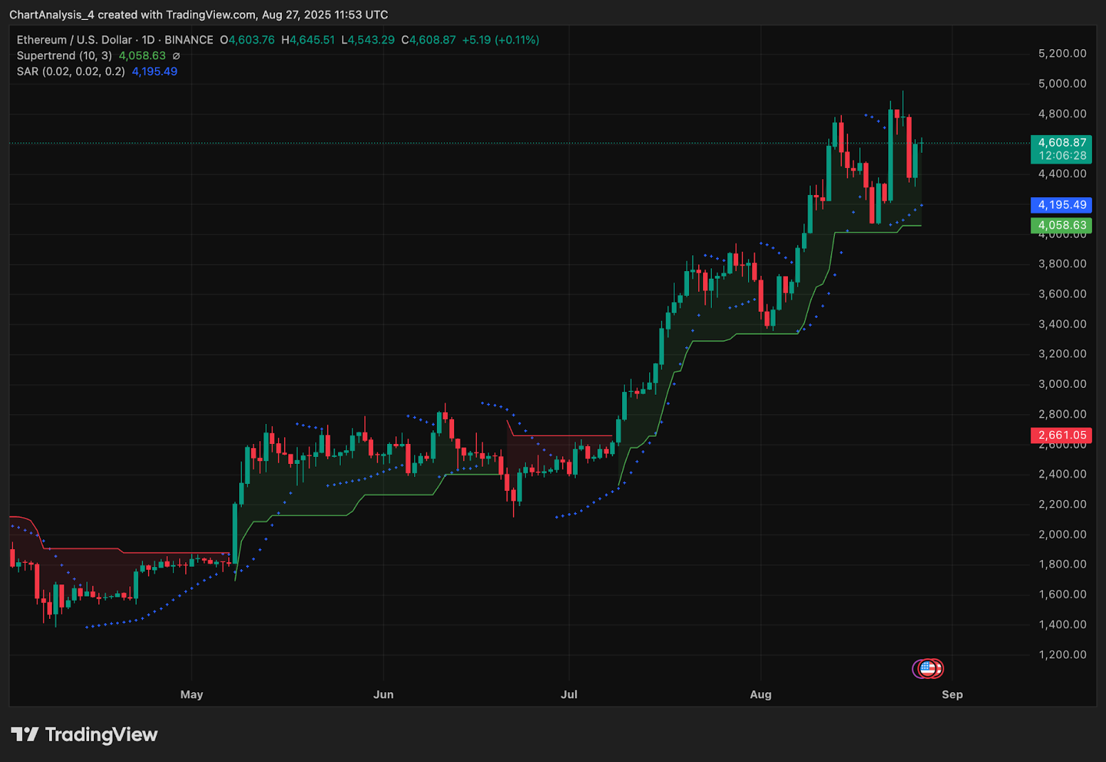 Индекс относительной силы (RSI) находится на уровне 53,1, что указывает на нейтральный импульс после отката с недавних уровней перекупленности. Рост RSI выше 60 будет означать попытку прорыва. Между тем, на дневном графике ETH удерживается выше уровня поддержки Supertrend на уровне $4058, в то время как точки Parabolic SAR остаются ниже цены, что подтверждает бычий тренд в долгосрочной перспективе.