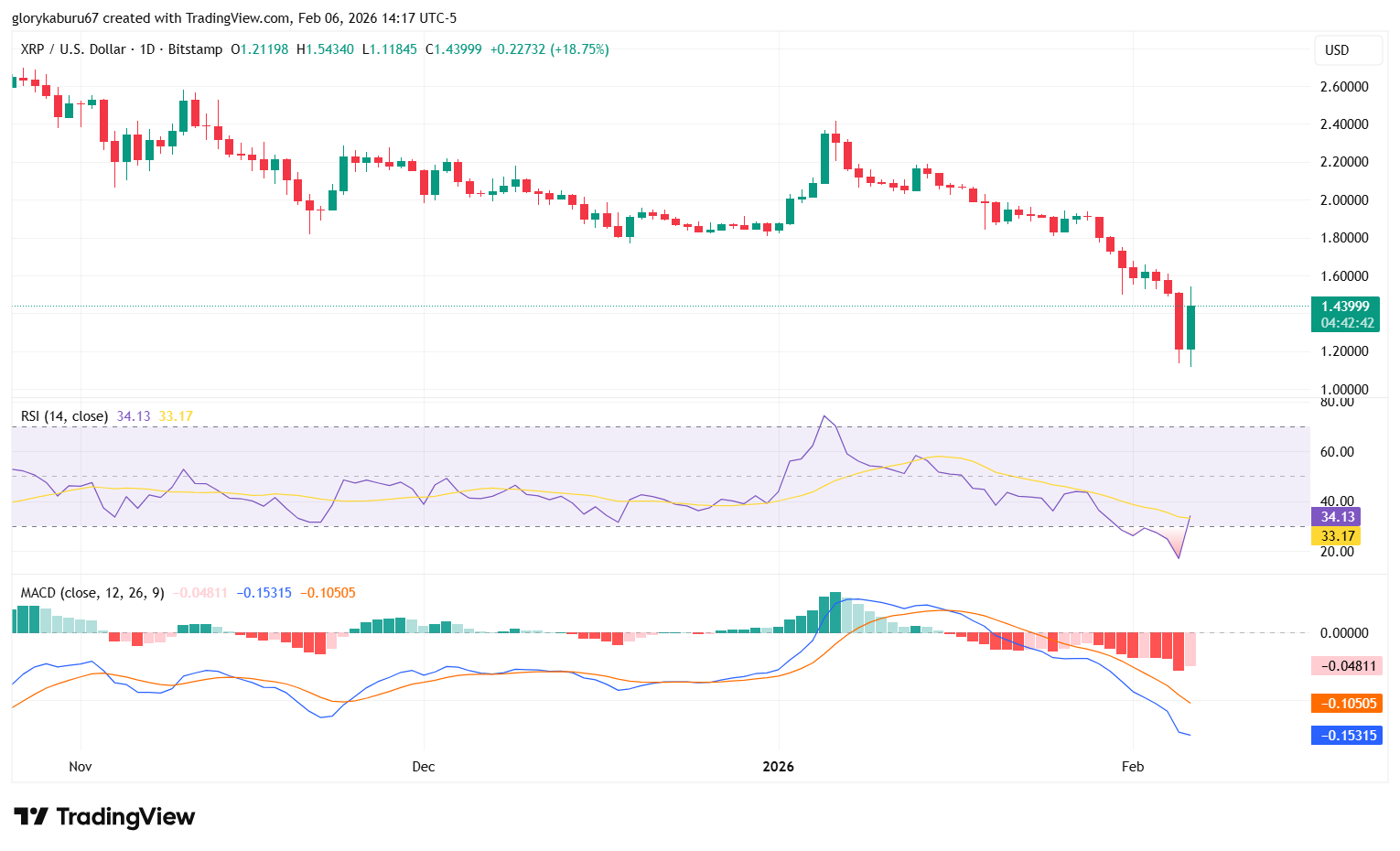 RSI находится на уровне 40,77, восстанавливаясь после сильно перепроданных уровней, но всё ещё ниже нейтраля. Индикатор показывает стабилизацию без сильной направленной уверенности. MACD остаётся отрицательным, но перестал снижаться, что говорит о снижении импульса.