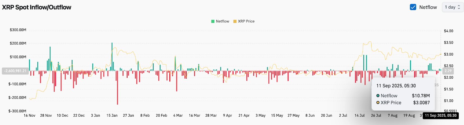 Данные о блокчейне подтверждают накопление. 11 сентября Coinglass зафиксировал чистый приток в размере 10,78 млн долларов, что стало крупнейшим однодневным положительным притоком XRP за последние несколько недель.