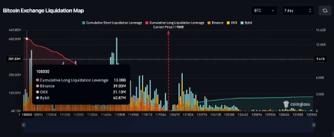 Карта ликвидаций позиций по биткоину на крупных криптобиржах. Источник: CoinGlass