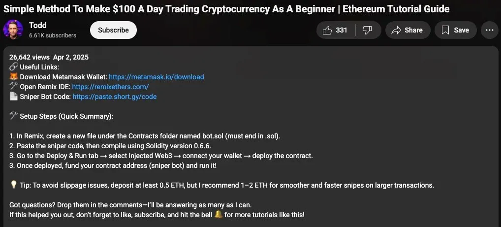 По данным специалистов, за запуск бота пользователей просят внести минимум 0,5 ETH (~$1829 по текущему курсу) для покрытия комиссий. Один мошеннический адрес уже получил около 244,9 ETH, еще два — 7,59 и 4,19 ETH. Суммарно это уже превышает $939 000.