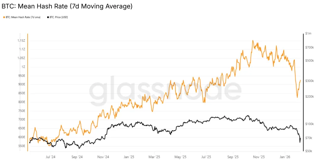 Согласно Glassnode, 30 января сглаженный семидневной скользящей средней хешрейт достиг локального минимума в 826 EH/s. После этого он поднялся к отметке 927 EH/s.