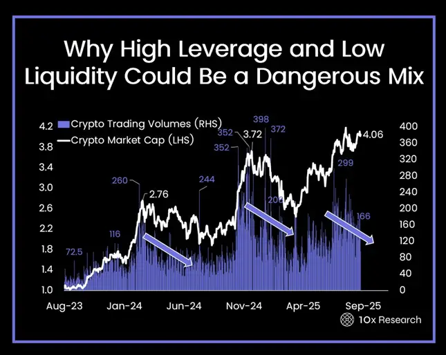 Инвесторы стали проявлять осторожность, и пока ликвидность не восстановится, резкие всплески волатильности будут продолжаться, заявили аналитики 10x Research. Объем торгов на биржах в течение последней недели несколько раз сокращался, а рост был краткосрочным, быстро сменяясь ослаблением структуры рынка и затяжными фазами коррекции.