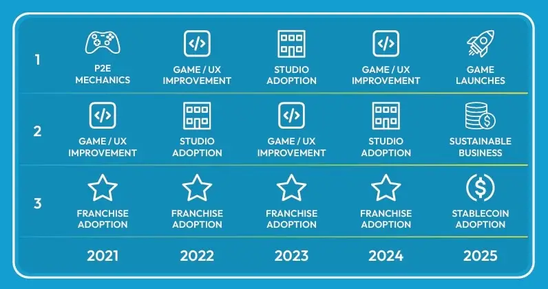 За пятилетний период заметно изменились приоритеты разработчиков. В 2021–2023 годах основное внимание уделялось внешним катализаторам: ажиотажу вокруг модели «играй, чтобы зарабатывать» (P2E) и ожиданиям участия крупных издателей Web2.