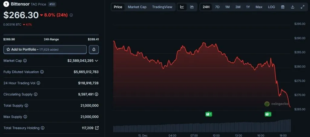 Котировки TAO за сутки обвалились на 8%. За последний год курс актива потерял почти 53%. Токен торгуется на отметках около $266, капитализация составаляет ~$2,5 млрд.