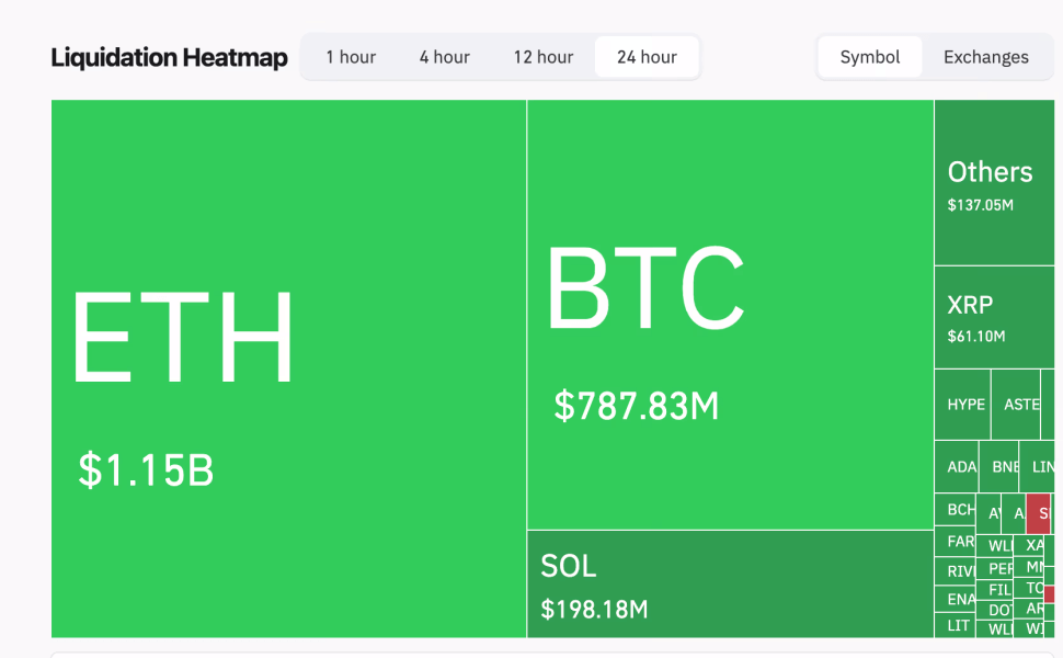 Основной удар пришелся на Ethereum: за последние 24 часа было ликвидировано позиций по $ETH на сумму более 1 150 000 000 долларов. Согласно данным карты ликвидаций, биткоин потерял примерно 788 000 000 долларов, а Solana – около 200 000 000 долларов.