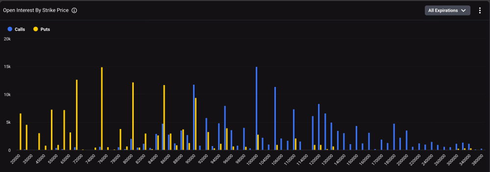 Хотя пут-опцион с ценой исполнения 75 000 долларов является наиболее популярной медвежьей стратегией, значительный открытый интерес также наблюдается по пут-опционам с ценами исполнения 70 000, 80 000 и 85 000 долларов, в то время как по колл-опционам с более высокими ценами исполнения, за исключением 100 000 долларов, нет аналогичной активности.