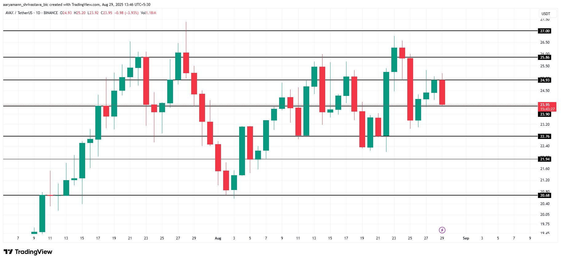 Если AVAX удержится на уровне поддержки $24,93, его цена может пойти вверх. Отскок от этого уровня укрепит позиции для возможного ралли к $25,00. Такой рост станет восстановлением после недавней волатильности и усилит бычьи сигналы для альткоина.