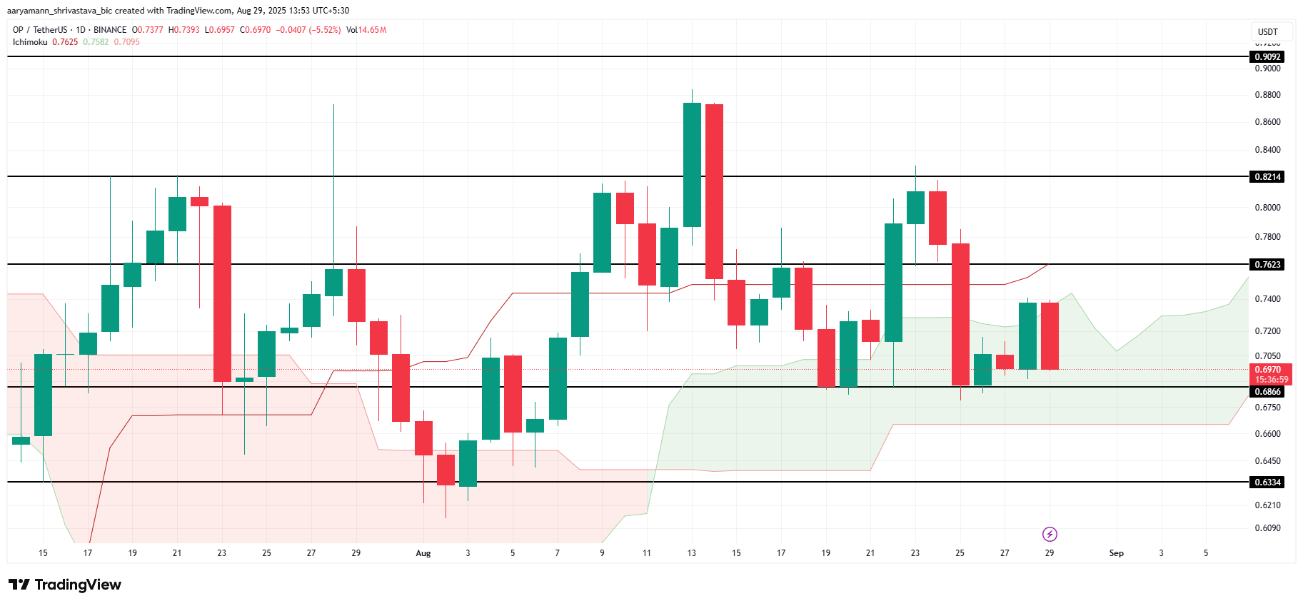 На момент написания OP торгуется на уровне $0,697 — выше поддержки на $0,68. Облако Ишимоку указывает на бычий сигнал, предполагая, что Optimism может сохранить краткосрочную стабильность. Этот индикатор отражает продолжающийся интерес рынка.
