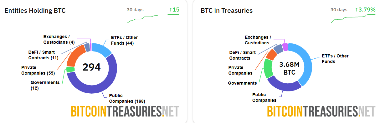 Государственные и частные компании приобрели миллионы BTC. Источник: BitcoinTreasuries.NET