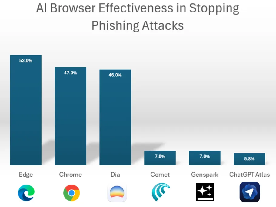 «Инъекция промпта» особо опасна при использовании Atlas: браузер держит пользователя в постоянной авторизованной сессии и почти не имеет встроенных антифишинговых защит. В результате проведенных тестов Atlas блокирует лишь около 5,8% фишинговых атак, тогда как Chrome и Edge — порядка 50%.