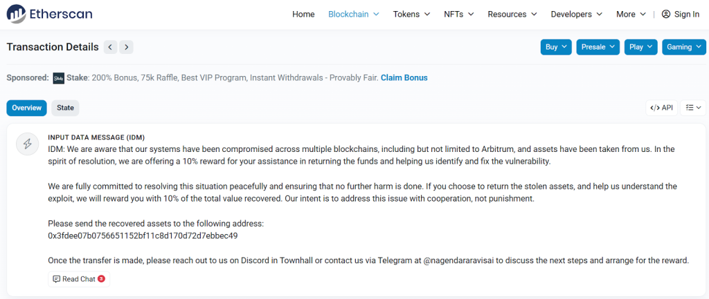 Связанный с командой проекта адрес отправил ончейн-сообщение предполагаемому хакеру, пообещав вознаграждение в размере 10% от похищенных средств.