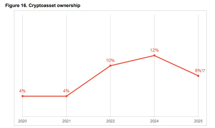 В период с 2024 по 2025 год доля владеющего цифровыми активами взрослого населения Великобритании уменьшилась с 12% до 8%. Об этом говорится в отчете FCA.